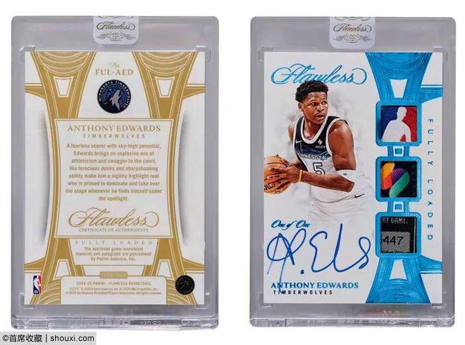 2020-21安东尼-爱德华兹/拉梅洛-鲍尔新秀双人亲笔签字球星卡,PSA10,估价1.5万-5万元;2018克里斯蒂亚诺-罗纳尔多亲笔签字球星卡1/1,估价1.5万-5万元;2024-25库里/汤普森双人球衣PATCH实物签字球星卡1/1,库里和汤普森双人签字实物Tag切割签字,估价50-300万元。